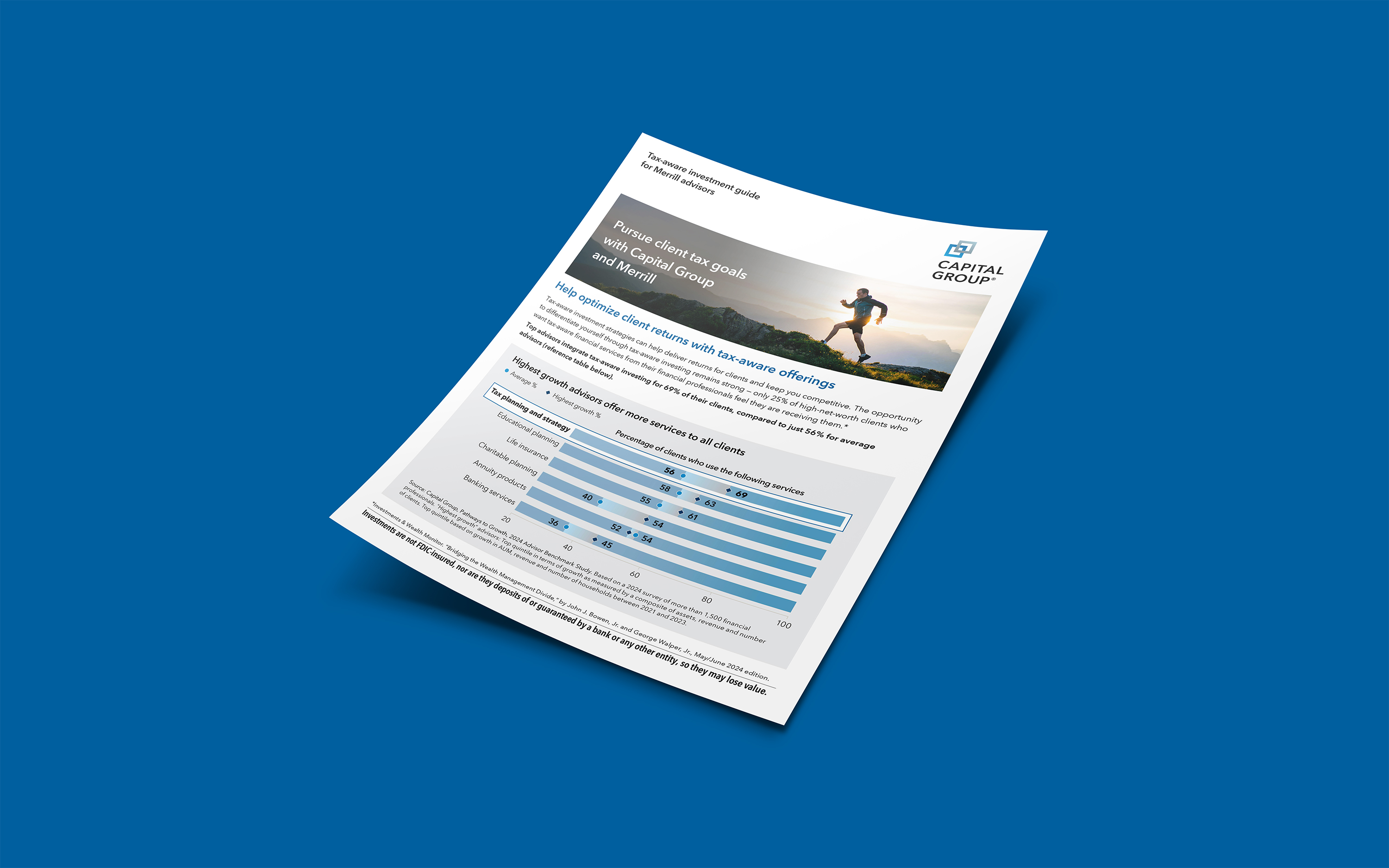 *This calculation is based on a 2024 survey in which Capital Group anonymously polled more than 1,500 financial professionals who together provided a representative view of the U.S. advisor landscape. In the “Pathways to Growth, 2024 Advisor Benchmark Study,” high-growth, highest growth or fastest growing advisors were defined as those advisors in the “top quintile in terms of growth as measured by a composite of assets, revenue and number of clients. Top quintile based on growth in AUM, revenue and number of households between 2021 and 2023. Percentage and absolute growth are equally weighted in the calculation.”