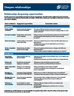 Spot key client moments to deepen engagement using tailored planning strategies and conversation starters across life and market events. Part of the digital course Build and lead a high-performing advisory practice.