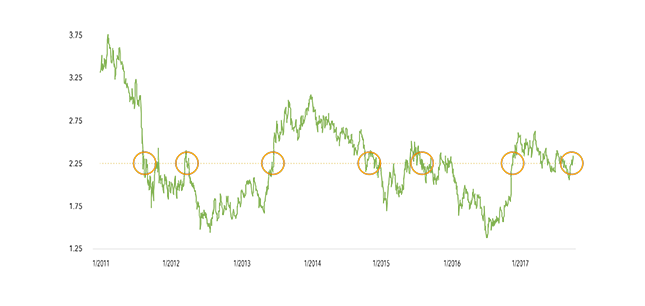 Long-term interest rates in the U.S. and much of the developed world remain at low levels. In the U.S., a number of factors have kept yields low, such as modest economic growth, persistently low inflation and strong demand from global investors for U.S. bonds. Long-term rates could rise modestly as U.S. economic growth remains robust and the Fed has started to trim its balance sheet, which means it will no longer be the largest buyer of bonds. Capital Group’s fixed income team expects the benchmark U.S. 10-Year Treasury yield to remain in a 2.25% to 3% range even though policy-driven rates are rising.