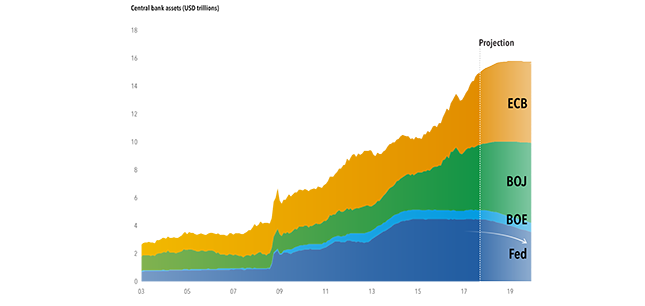 Sources: Capital Group, Thomson Reuters as of 9/30/17. European Central Bank (ECB), Bank of Japan (BOJ), Bank of England (BOE), U.S. Federal Reserve (Fed).