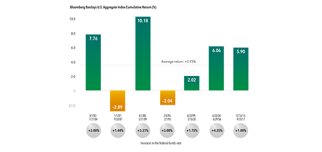 As the Fed continues on a path of gradually raising interest rates, many investors are moving to cash, short-term bonds and floating-rate securities. But the view that bonds have to suffer losses when short-term rates rise is a misconception. Looking at the past seven periods of interest rate hikes, including the current period, investment-grade bonds (BBB/Baa and above) have generally delivered positive returns, as can be seen from results for the Bloomberg Barclays U.S. Aggregate Index.