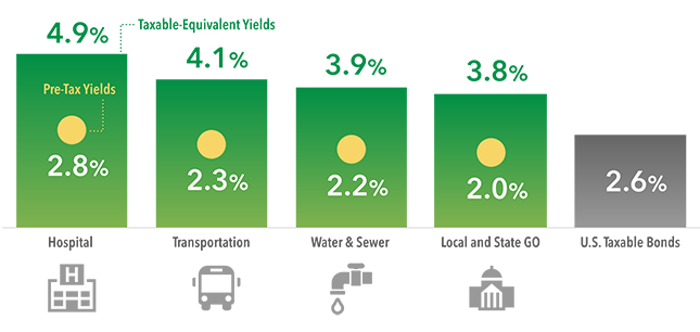 Sources: Bloomberg Index Services Ltd. as of 10/31/17. Income from municipal bonds may be subject to state or local income taxes and/or the federal alternative minimum tax. Certain other income, as well as capital gain distributions, may be taxable. Methodology for calculation of taxable-equivalent yield: Based on 2017 federal tax rates. For the year 2017, there will be an Unearned Income Medicare Contribution Tax of 3.8% that applies to net investment income for taxpayers whose modified adjusted gross income exceeds $200,000 (for single filers) and $250,000 (for married filing jointly). Thus taxpayers in the highest tax bracket will face a combined 43.4% marginal tax rate on their investment income. The federal rates do not include an adjustment for the loss of personal exemptions and the phase-out of itemized deductions that are applicable to certain taxable income levels. Index proxies: municipal sectors from Bloomberg Barclays Municipal Bond Index; Bloomberg Barclays U.S. Aggregate Bond Index for U.S. taxable bonds.The indexes are unmanaged and, therefore, have no expenses. Investors cannot invest directly in indexes.